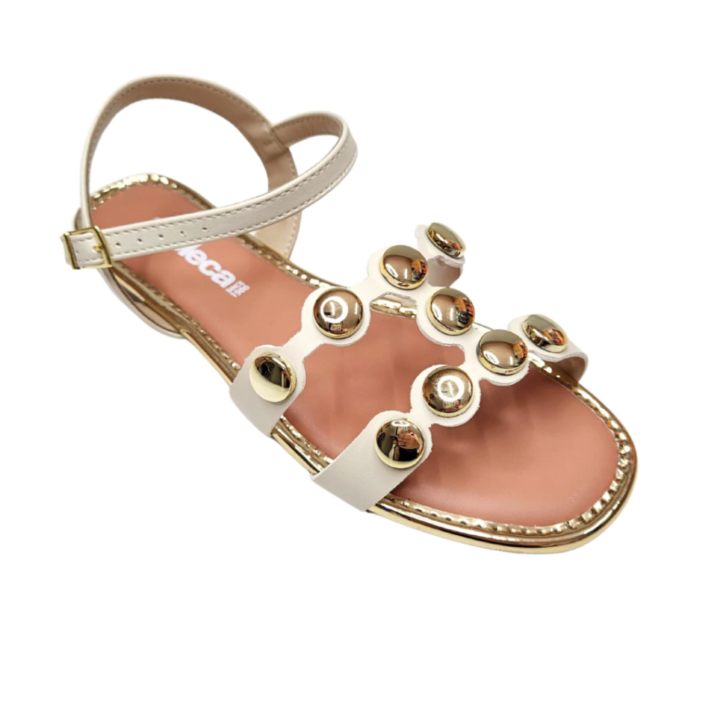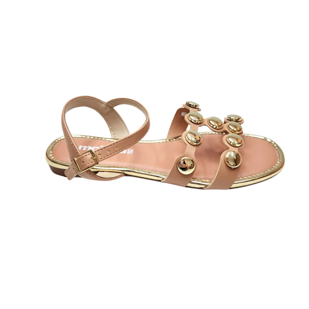 Essa sandália feminina tem um estilo moderno e ousado, perfeita para quem gosta de se destacar. Confeccionada em material sintético, ela apresenta tiras largas adornadas com grandes aplicações metálicas circulares, que conferem um visual marcante e cheio de personalidade.