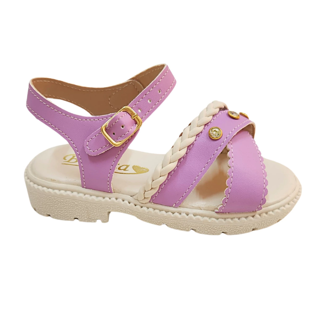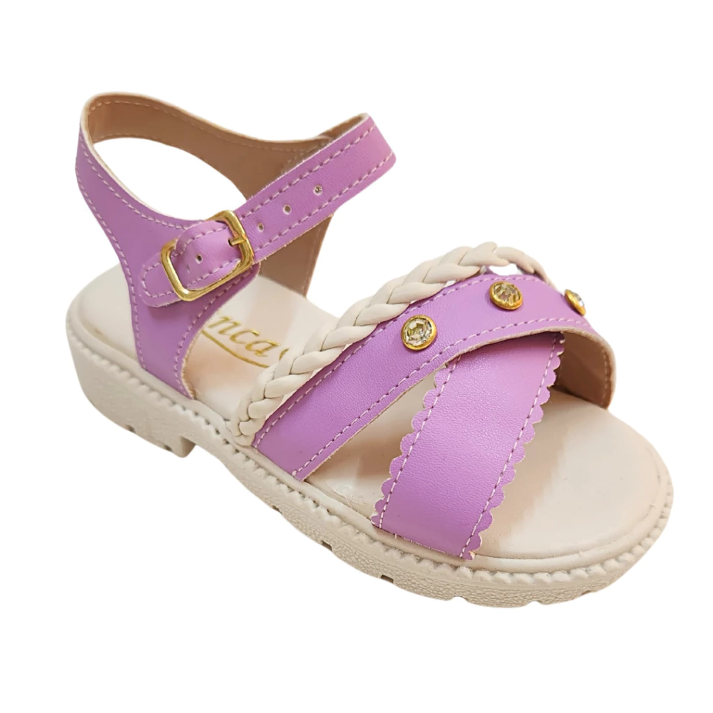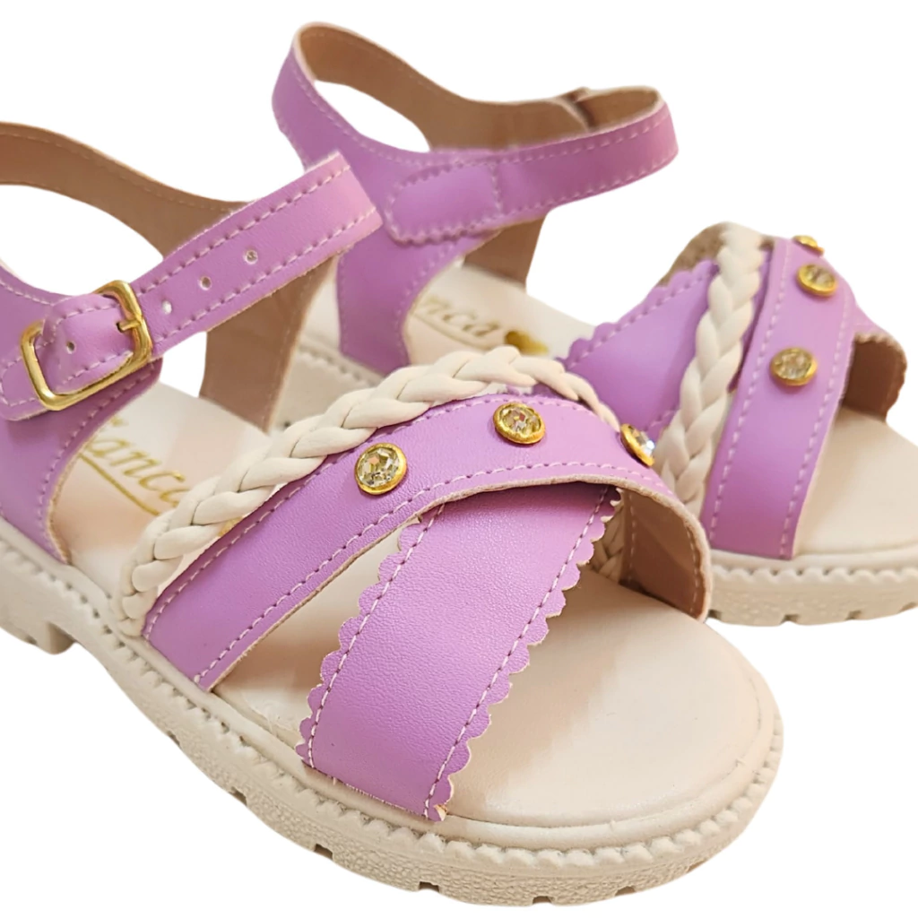 Encante com estilo e delicadeza! Esta linda sandália infantil na cor lilás é ideal para dar um toque especial ao look das pequenas. Possui tiras cruzadas com acabamento em bordas onduladas, detalhe trançado em tom off-white e pedrinhas de strass dourado que brilham com charme. O fechamento com fivela ajustável garante conforto e segurança ao caminhar. Perfeita para passeios e eventos especiais.