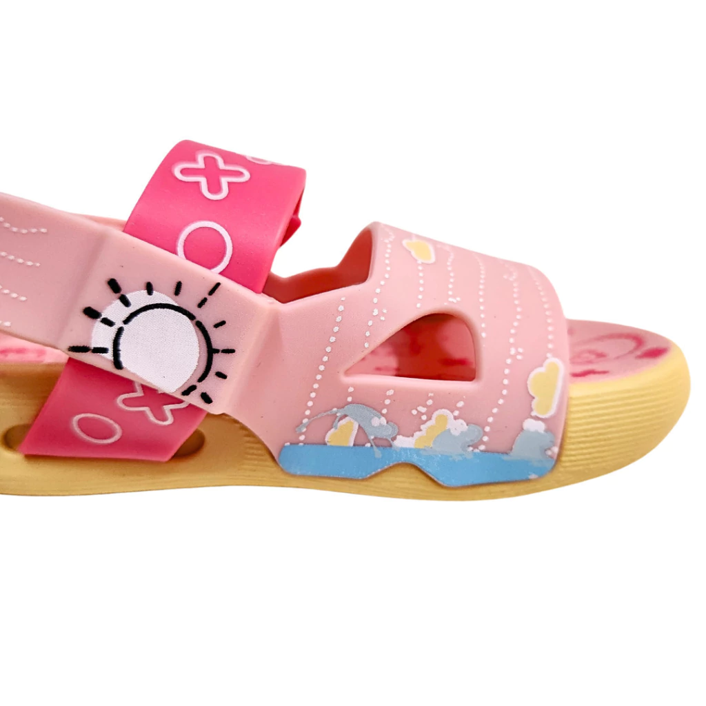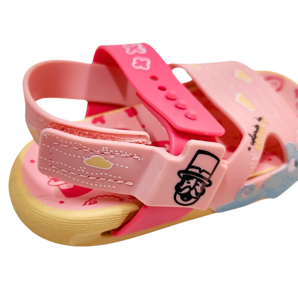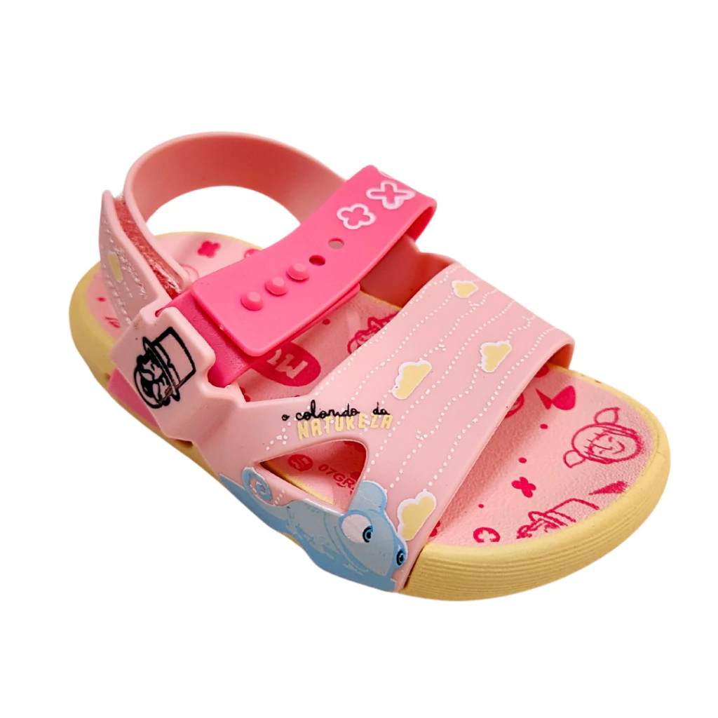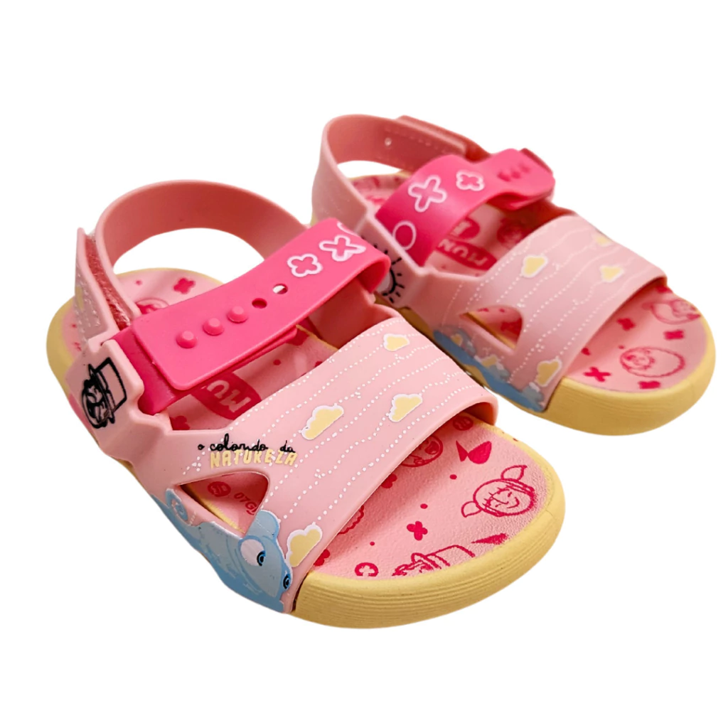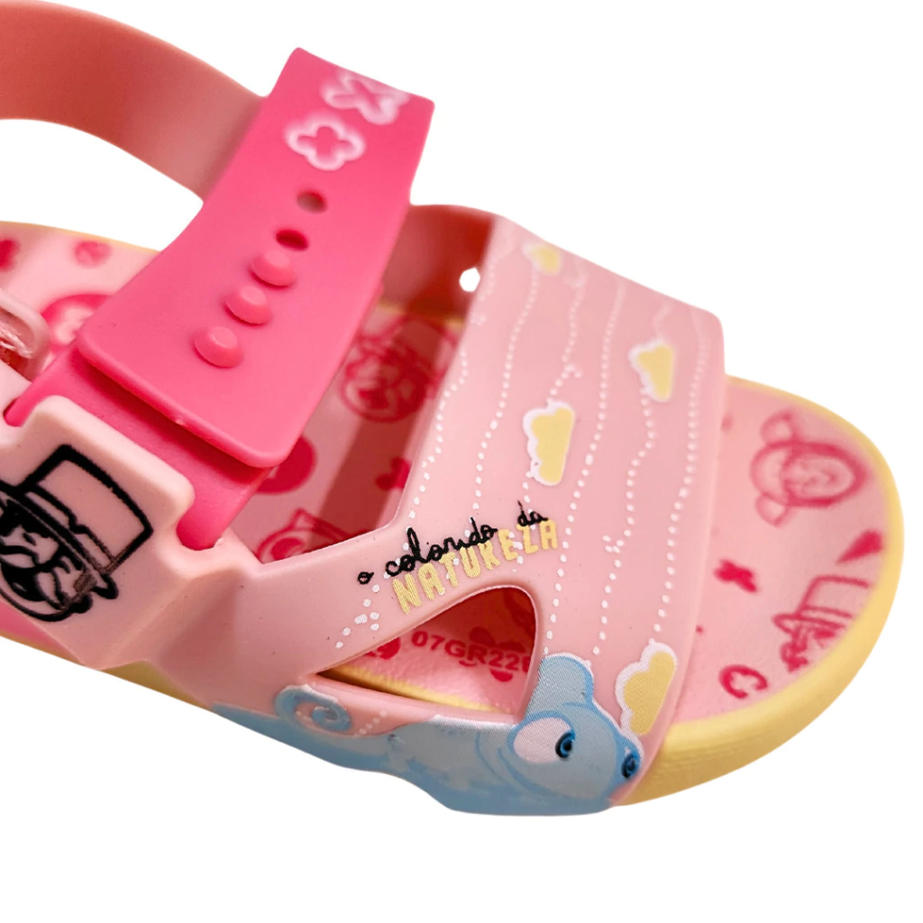Com um visual alegre e delicado, essa sandália infantil rosa é perfeita para meninas que adoram cor e personagens divertidos. Estampada com nuvens, ursinhos e detalhes lúdicos, ela traz um toque encantador ao visual. O fechamento prático com botão ajustável proporciona segurança e conforto, ideal para acompanhar as brincadeiras do dia a dia com estilo e liberdade. Uma escolha fofa e funcional para os pés das pequenas.