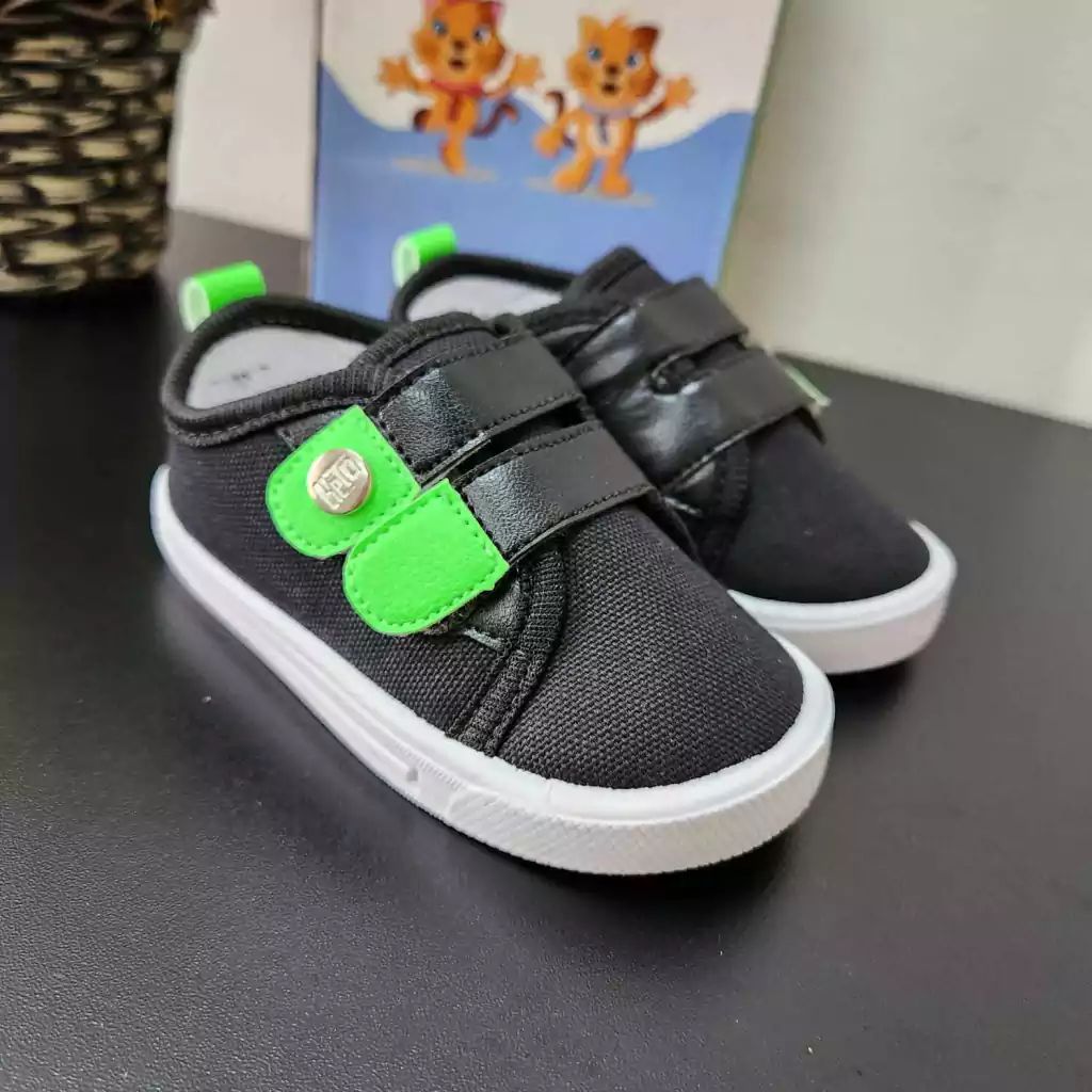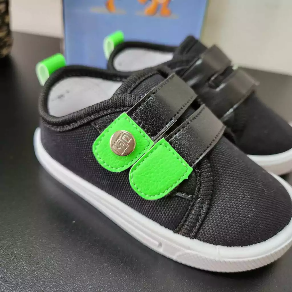 Confeccionado em lona e material sintético de alta qualidade. Possui fecho duplo em velcro. Palmilha confortável e solado maleável. Possui frisos antiderrapantes que garantem segurança ao caminhar.